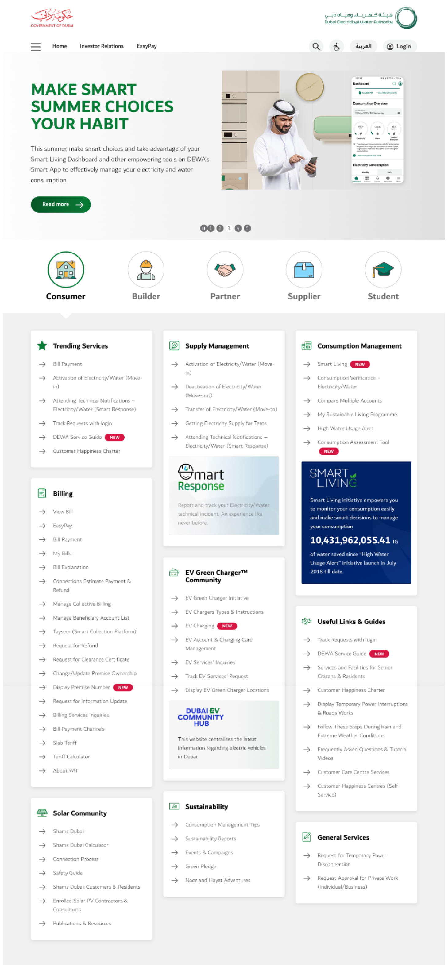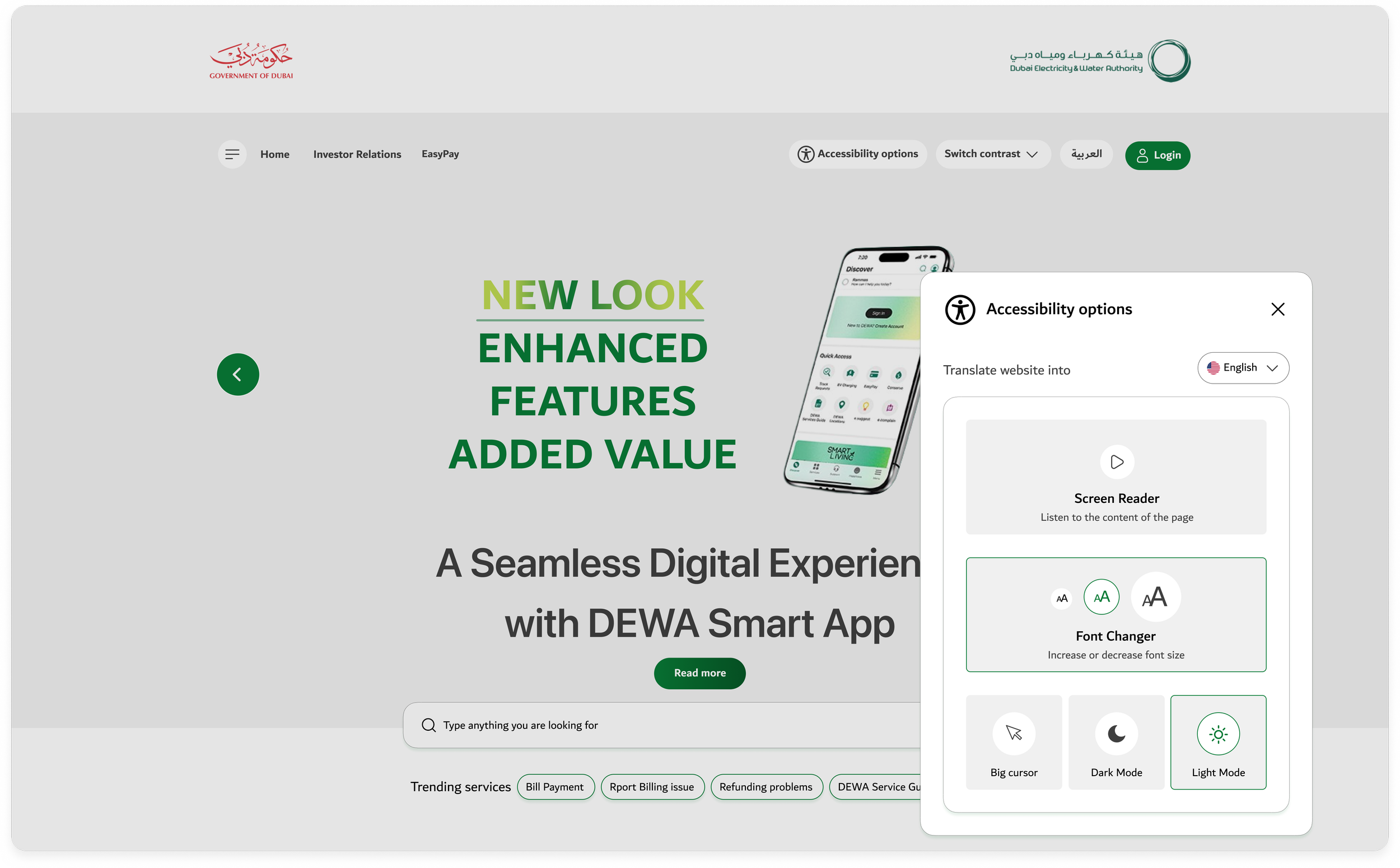 Please redesign a fresh look for the DEWA website homepage using the link provided, while ensuring it aligns with the latest UI trends and maintains accessibility considerations. https://www.dewa.gov.ae/